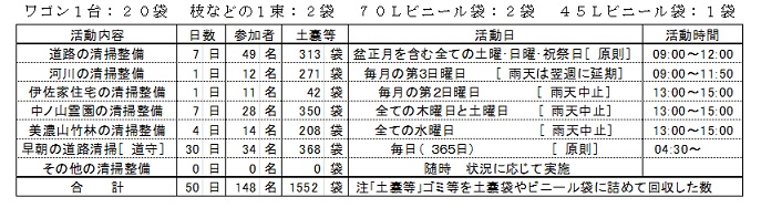 表は当月に行った八幡ルネの活動を示すものであって、定例的に実施している清掃整備活動の延べ日数、延べ参加者数、清掃整備活動で回収したゴミなどの量は、次の土嚢袋に換算して記載しています。