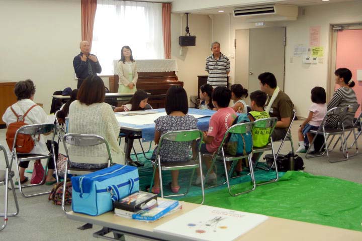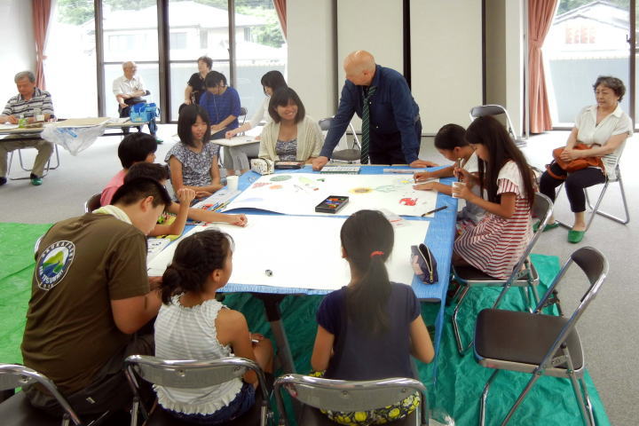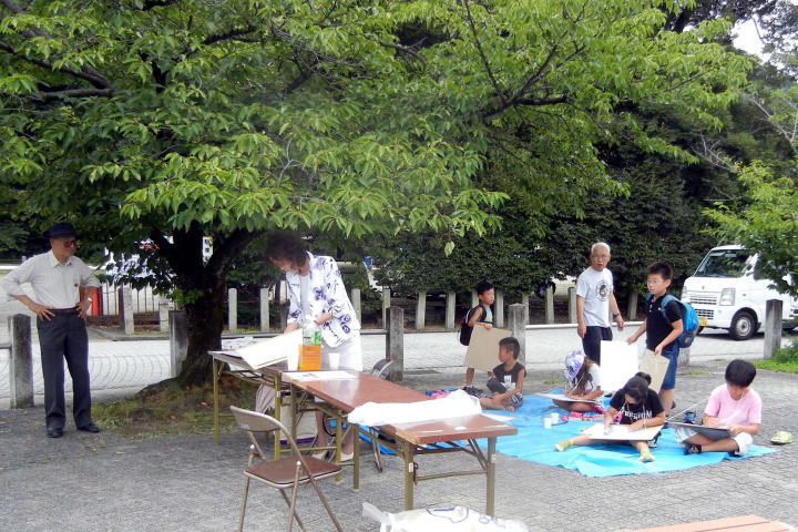 本番前日に行われた安居橋での写生会、山柴公民館での画伯との共同制作には、多くの小学生や愛好家が画伯とともに絵画を楽しまれ、その日の作品は絵画展会場の正面に展示されました。