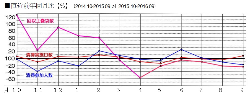 このグラフは、2015年10月より2016年9月までの当年清掃活動実績を前年清掃活動実績と比較し、月毎の増減を比率(%)で示したものであって、「回収土嚢袋数」は雑草や土砂を含むゴミなどを、ビニール袋や土嚢袋に詰めて回収した数量の比較、「清掃実施日数」は清掃を実施した日数の比較、「清掃参加人数」は清掃に参加したボンティア人数の比較をで示すものである。