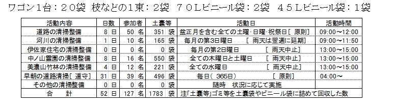 表は当月に行った八幡ルネの活動を示すものであって、定例的に実施している清掃整備活動の延べ日数、延べ参加者数、清掃整備活動で回収したゴミなどの量は、次の土嚢袋に換算して記載しています。