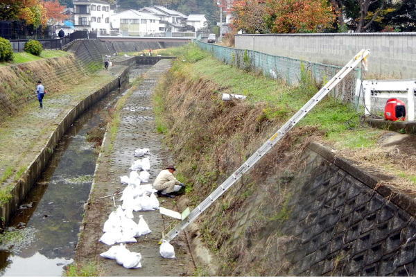 11月20日(日)は大谷川の定例清掃日、この日は通常の清掃作業と並行して、法面雑草の刈り取り作業が行われ、草刈り機に装着した刃(チップソー)をナイロンの紐を使用した刃(ナイロンカッター)に取り替えて、雑草を刈り払う作業を行いました。 ナイロンカッターは、刃先が法面の間地ブロックに接触した場合でも、間地ブロックを傷つけることなく刈り払い作業が効率よく行え、刈り取った雑草を含み参加した11名のボンティアは、土嚢袋にして179袋の雑草や土砂等のゴミを回収しました。