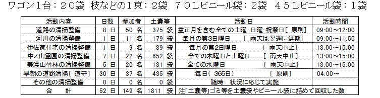 表は当月に行った八幡ルネの活動を示すものであって、定例的に実施している清掃整備活動の延べ日数、延べ参加者数、清掃整備活動で回収したゴミなどの量は、次の土嚢袋に換算して記載しています。
