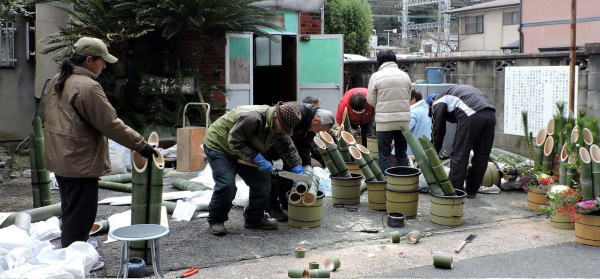 今年も12月28日に「八門松作り」が朝から行われ、参加した11名のボランティア(2名は午前参加)は、竹を切って形を整えたり鉢に菰を巻いたり、作業分担をして18基の門松製作に取りかかりました。 昼には、ボランティアから差し入れられた手作りの「いなり寿司」と暖かい「味噌汁」、遠慮なく美味しく頂いて舌鼓、午後も頑張って15時には全てが完成し、発注された各々のお宅に配達されました。