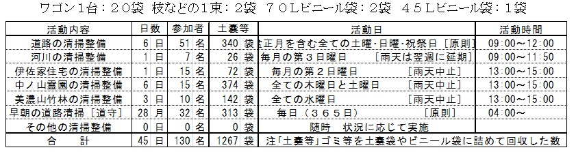 表は当月に行った八幡ルネの活動を示すものであって、定例的に実施している清掃整備活動の延べ日数、延べ参加者数、清掃整備活動で回収したゴミなどの量は、次の土嚢袋に換算して記載しています。