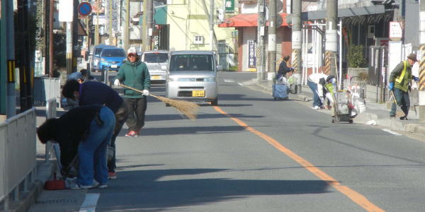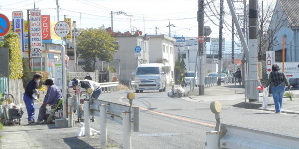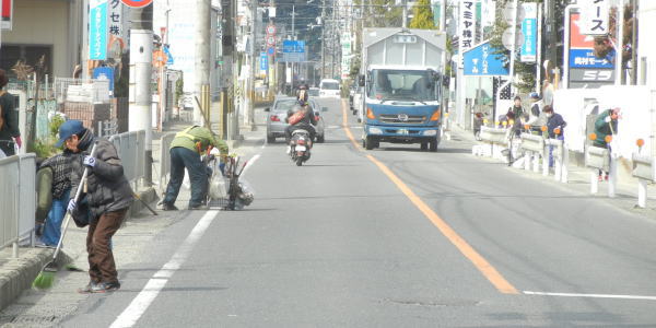 府道八幡木津線は交通量が多く、大型車両も行き来する中で三本橋交差点から八幡東浦までの約800mに渡って道路の清掃が行われ、この3日間の清掃に参加したボランティアは延べ32名、歩道のゴミや雑草、路肩や縁石近くの土砂や雑草を144袋の土嚢袋に詰めて回収しました。