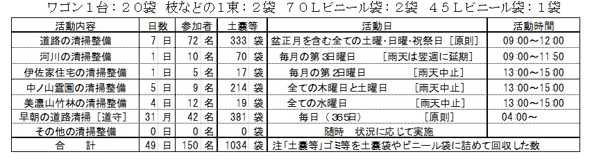 表は当月に行った八幡ルネの活動を示すものであって、定例的に実施している清掃整備活動の延べ日数、延べ参加者数、清掃整備活動で回収したゴミなどの量は、次の土嚢袋に換算して記載しています