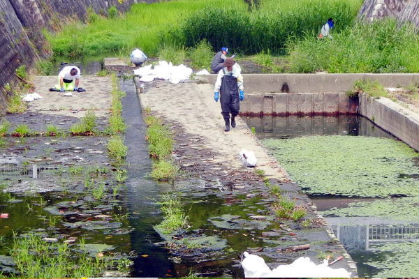 5月21日(日)は大谷川の定例清掃日、この日は旧大谷川に設置された「ゴミのフェンス」によって堰き止められている大量のゴミを回収するために、ウエーダー(写真のような胸までの長靴)を着用した低水路内の作業と、取り出されたゴミを土嚢袋に詰める作業が分担して行われ、平行して草刈り機による葦などの切り払いや、低水路内に投げ捨てられたゴミの回収など、通常通り作業が進められており、11名のボランティアが参加して回収したゴミは、土嚢袋にして124袋になりました。