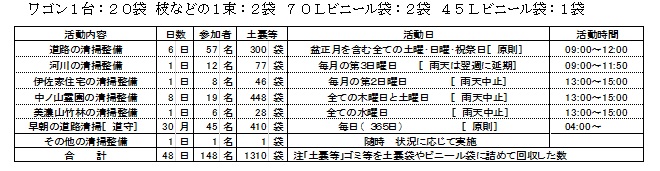 表は当月に行った八幡ルネの活動を示すものであって、定例的に実施している清掃整備活動の延べ日数、延べ参加者数、清掃整備活動で回収したゴミなどの量は、次の土嚢袋に換算して記載しています。