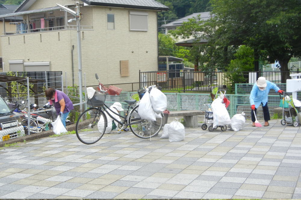 7月9日(日) この日は八幡旦所方面の清掃となり、府道の清掃と「あずまや」と呼ばれる封鎖された憩いの場(山路橋周辺)の清掃が行われ、回収したゴミを詰めた土嚢袋を、軽トラックで回収するであろう府道に出そうとした時、軽トラックは目の前を通過、やむなく自転車で土筒袋を搬送しました。