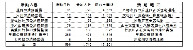 次の表は、八幡ルネ第19期の清掃活動の実績を示すものであり、八幡市内の府道および住宅街等の道路清掃、地元を流れる大谷川の清掃整備、国指定重要文化財の伊佐家住宅の清掃整備、四条隆資卿と兵を祀る正平塚古墳や石清水八幡宮四十八坊有縁上人の墓所のある中ノ山墓地の清掃整備、八幡の竹で作る竹炭による大谷川の浄化実験を兼ねた美濃山竹林の清掃整備、八幡ルネの代表が行う早朝の道路清掃[道守]など、延べ1756人のボランティアが活動に参加し、回収したゴミは土嚢袋にして17201袋になりました。
