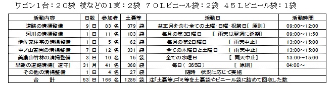 表は当月に行った八幡ルネの活動を示すものであって、定例的に実施している清掃整備活動の延べ日数、延べ参加者数、清掃整備活動で回収したゴミなどの量は、次の土嚢袋に換算して記載しています。