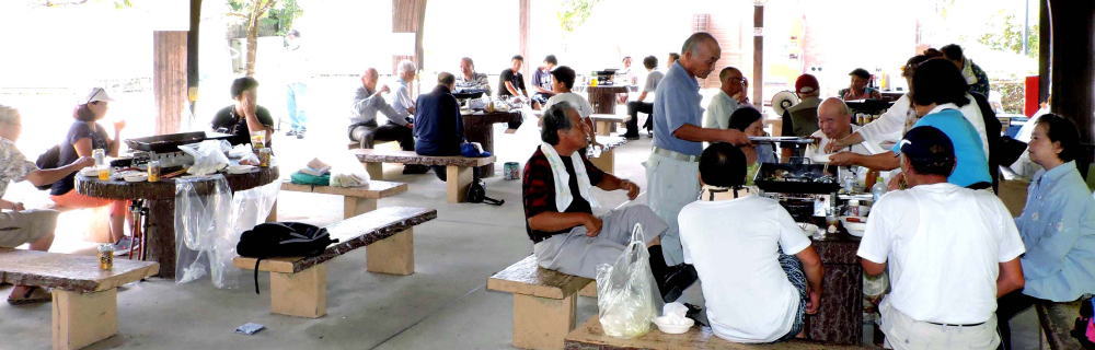 8月13日に開催された恒例のBBQ大会当日は、前日に食材の仕入れと野菜の調理を行ったスタッフに加え、八幡ルネの事務所から食材や参加者をBBQ会場に運ぶスタッフが事務所に集合して積み込みを行い、11時のBBQ開催に向けて男山レクリエーションセンターに移動、会場の準備は参加者も加わって「10時30分準備完了」と思いきや、食材を焼き始めるテーブルに「ちょっと待って」の声も届かずコントロール不能の状態、八幡ルネ代表の挨拶と乾杯の音頭を前倒しにBBQ大会が開始されました。