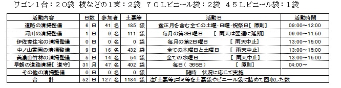表は当月に行った八幡ルネの活動を示すものであって、定例的に実施している清掃整備活動の延べ日数、延べ参加者数、清掃整備活動で回収したゴミなどの量は、次の土嚢袋に換算して記載しています。