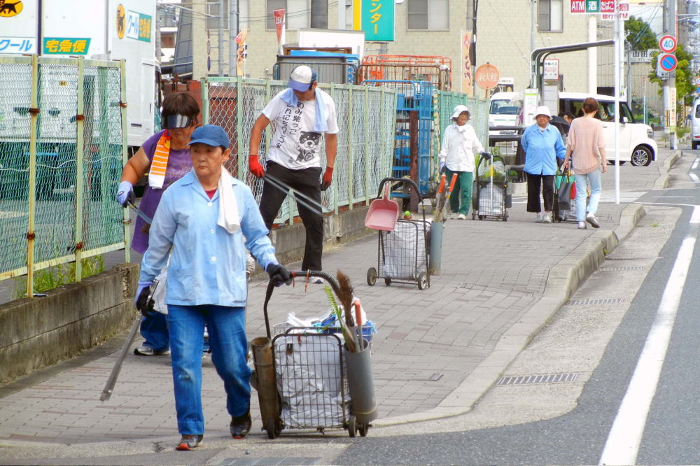 9月2日(土) 今日の清掃作業は府道長尾八幡線を市役所前から八幡警察署の前を通り、八幡軸の方向にカートを引きゴミバサミを片手に歩道のゴミを拾い雑草の処理を行いながら南下して、八幡警察署の前から八幡軸の方面に道路清掃を行いました。