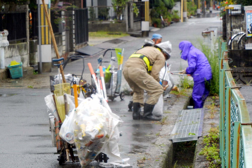 9月16日(土) 九州に接近する大型台風18号の影響を受けて八幡市の天候は降ったり止んだり、6名のボランティアは雨合羽に長靴姿で、八幡園内方面に向かって清掃作業を行いました。