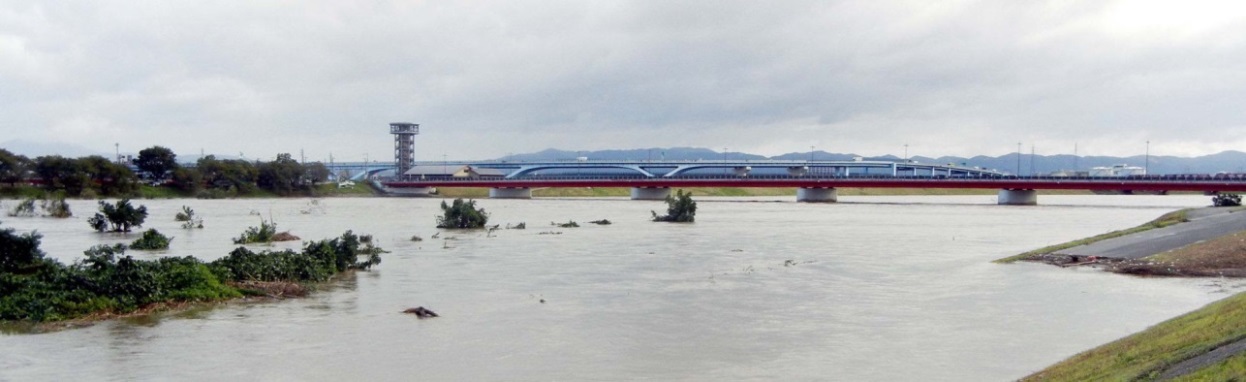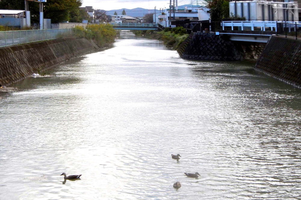 翌朝に竹林の倒れた竹や淀川の河川敷が冠水する状況を見て、大谷川の増水を見に向かいましたが河川敷は冠水しているものの水位は低く、数羽の鳥が増水した川面を泳いでいました。