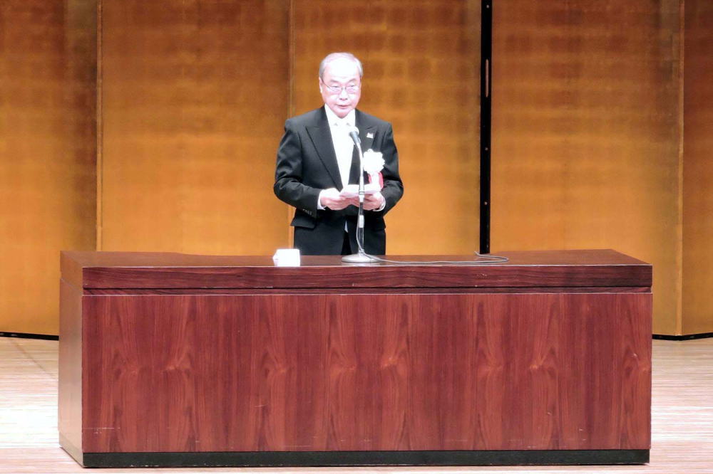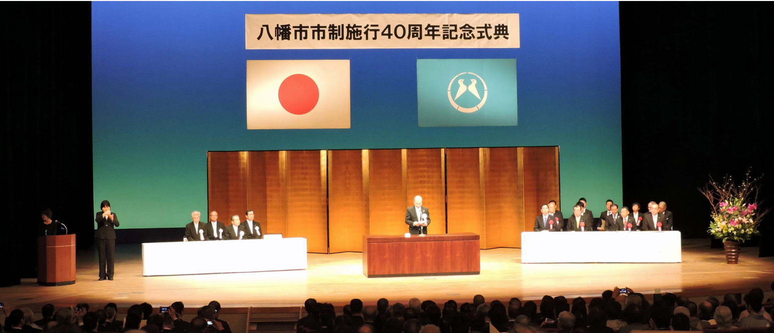 11月19日(日) 八幡市文化センターの大ホールでは「市制施行40周年記念式典」が行われ、開会前に和太鼓や舞太鼓に篠笛が加わった演奏が披露された後、緞帳が静かに上がったステージでは、開式の辞に続いて国歌の斉唱、そして「永久に守らん我が町八幡」と唄う「八幡市歌」が斉唱され、次いで「市長挨拶」(写真)、「市議会議長挨拶」と式典が進められました。
