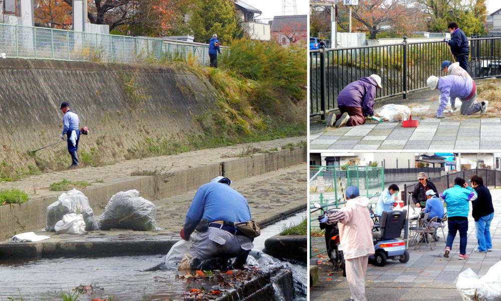 11月26日(日) この日は女性ボランティアの参加も多く、通常の河川の清掃作業と法面雑草を草刈り機で刈り取る作業(写真左)に加え、女性達は堤防の路面に生えた雑草処理(写真右上)や、フェンスに伸びたツル等の処理に注力し、作業の後は閉鎖された「あづまや」と呼ばれる憩いの場の近くで暫し休憩(写真右下)です。