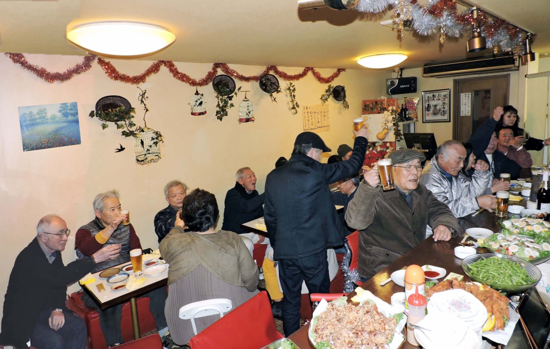 12月23日(土) 恒例の忘年会は八幡ルネ初めての試み「カラオケ」で行われ、会場となった八幡三本橋近傍の「おやすみ処 開」を午後5時~8時まで貸し切り、幹事の熱心なお誘いで参加者は19名とほぼ満席でした。