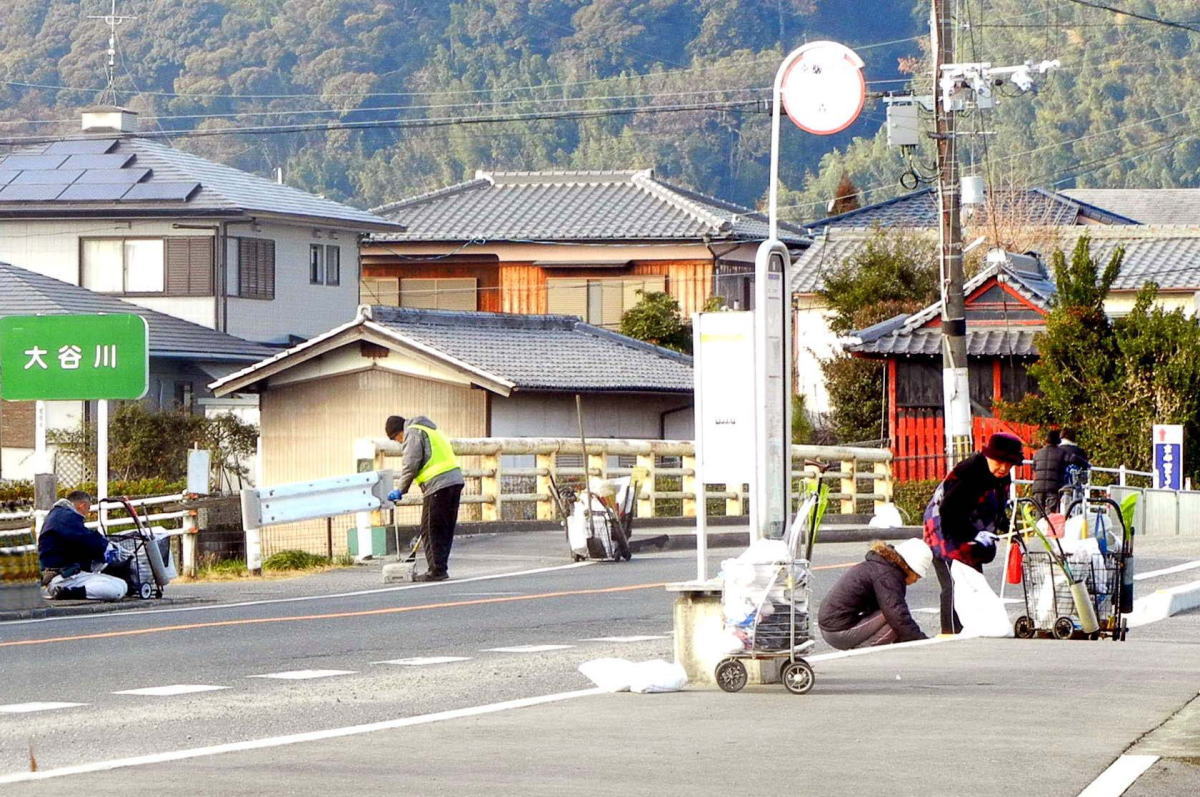 1月8日(成人の日)も小雨の中で道路清掃が行われ、3日間連続しての清掃活動です。