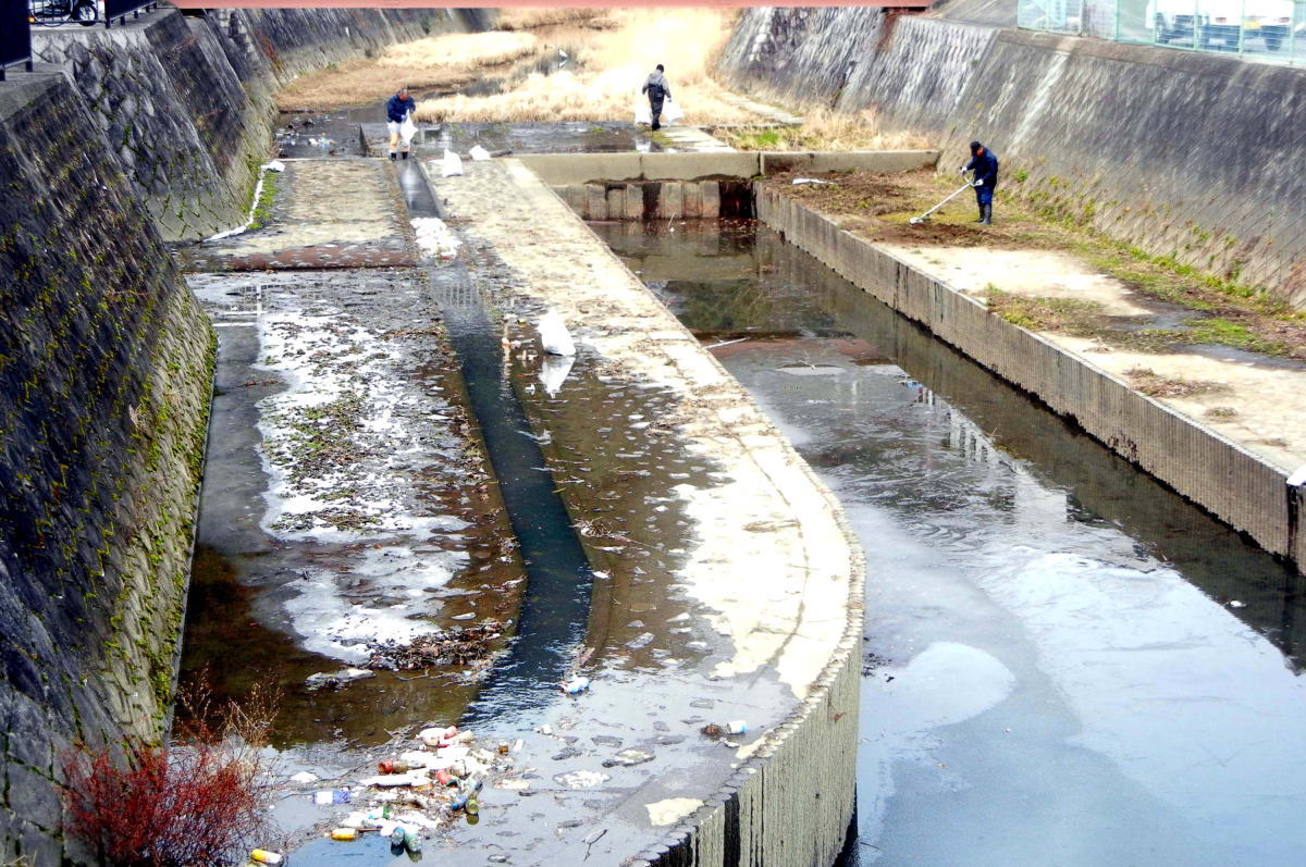寒さに耐えて河川敷の雑草を草刈り機で刈り取る作業(写真右)と、放生川に流入する側路に停留したポイ捨てゴミ(写真左)を回収する作業に加え、閉鎖中の憩いの場(あづまや)周辺に生える雑草処理を、参加したボランティア10名で並行して行われ、回収したゴミ・土砂・雑草等は土嚢袋にして149袋になりました。