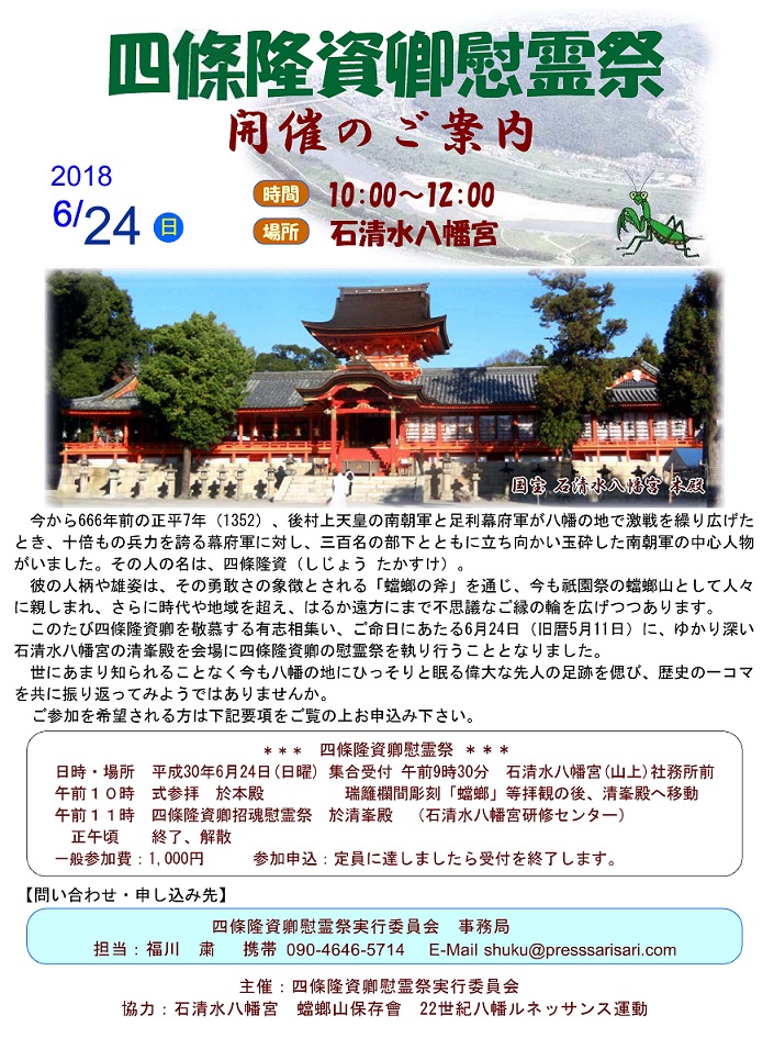本年6月24日に石清水八幡宮において「四条隆資卿慰霊祭」が午前10時に執り行われます。一般市民の参加も受け付けるために、前記慰霊祭を案内するチラシを可及的速やかに作成して配布することが決定されるとともに、石清水八幡宮の広報や新聞社等の取材も視野に入れた検討が進められますが、参加総数が60名とされることから、参加者が定員になりましたら受付を終了されるようです。