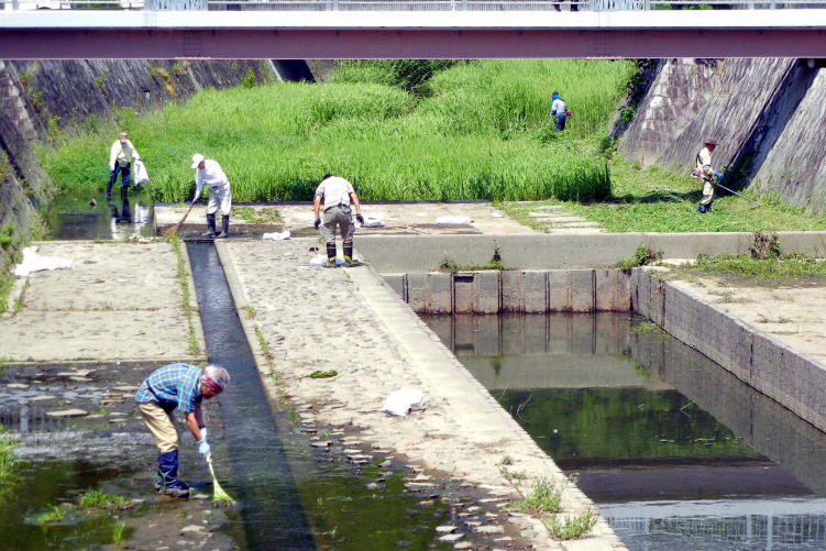 5月27日 (日) は定例清掃日、普段の清掃と同様に草刈り機2台で繁茂した草を刈り取り、側溝に配設されたグレーチング(格子状の蓋)に堆積したゴミを取り除き(写真参照)、水路に捨てられたゴミを回収するなど、河川敷での作業を男性が、「あづまや」と呼ばれる憩いの場や道路の雑草処理を女性は行い、この日に参加した13名の清掃ボランティアが回収した雑草やゴミは、土嚢袋にして64袋になりました。