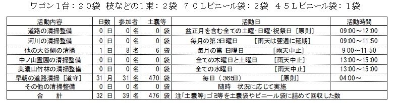表は当月に行った八幡ルネの活動を示すものであって、定例的に実施している清掃整備活動の延べ日数、延べ参加者数、清掃整備活動で回収したゴミなどの量は、次の土嚢袋に換算して記載しています。