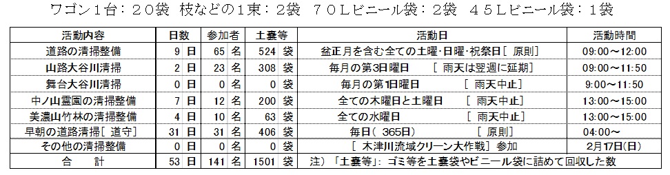 表は当月に行った八幡ルネの活動を示すものであって、定例的に実施している清掃整備活動の延べ日数、延べ参加者数、清掃整備活動で回収したゴミなどの量は、次の土嚢袋に換算して記載しています。