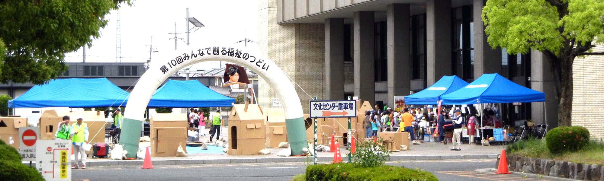 5月18日(土)の八幡市役所前広場には、段ボールで作られたハウスが数多く建ち並び「わくわくきらきらフェスティバル」と称する「みんなで創る福祉のつどい」が16を超える協力団体の参加とともに開催され、「紙ヒコーキ大会」や「健康長寿コーナー」、車椅子体験などの「ふくし体験隊」、壊れたおもちゃを修理する「おもちゃの病院」などなど、年齢や障害などに関係なく、幅広い多くの市民が参加されていました。
