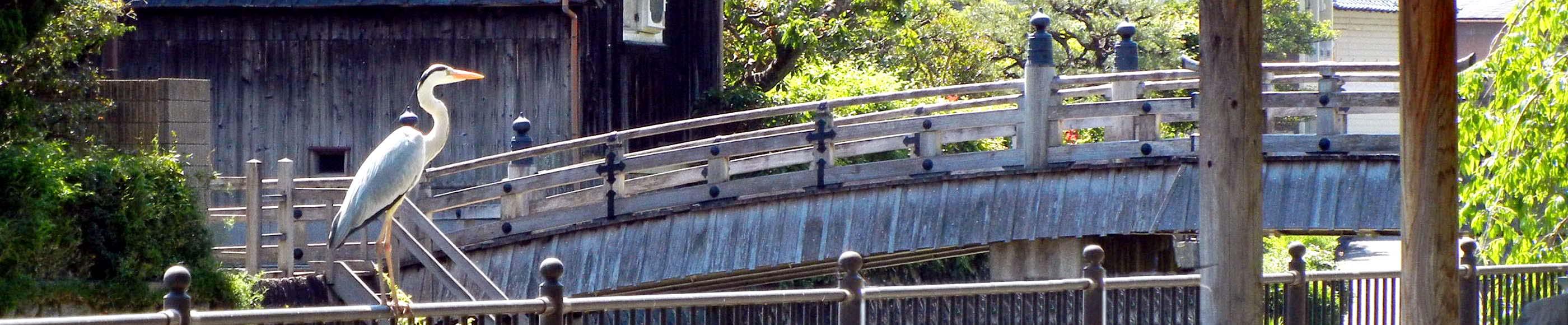 「安居橋」近くの人前に「鷺」が飛来しました。 調べますと「青鷺」のようで「サギ科、全長約95㎝、背面が青灰色、目の後方と冠羽が黒く、魚・ザリガニ・カエルなどを食べる」と記載されていました。