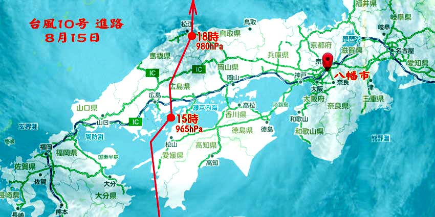 8月15日 台風10号の上陸が放送される中、携帯電話には「避難準備」を促すメールが八幡市より配信され、パソコンには「避難準備」とともに「警戒レベル3」が表示されていて、特に避難準備を必要とする地域は31、総世帯数681世帯、総人数1362人、その地域は「地図」で示されておりました。
