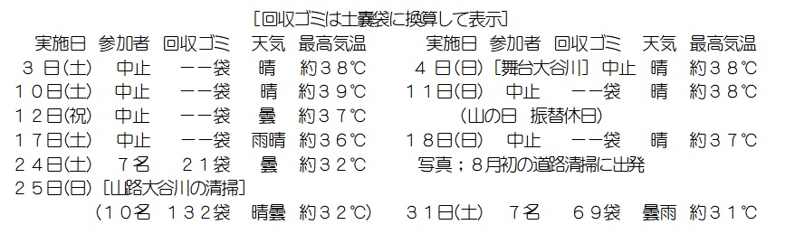 8月は、最初の清掃日から「気温35℃超」の真夏日で清掃中止、24日になると気温が下がり、長い夏休みが終り,なまった体のボランティア達は、清掃モードに突入、和気藹々の清掃を再開しました。