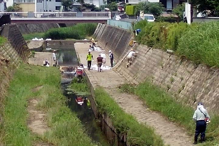 6月16日(日)、この日の大谷川はご近所から4名の初参加と五月会から1名の参加があり、総勢20名のボランティアで先回同様に雑草や蓄積した土砂の清掃に加え、水路へ投棄されたアルミ缶やガラス瓶、壊れた傘やビニール袋に入れた不要品などの回収作業を水路に入って行われました。