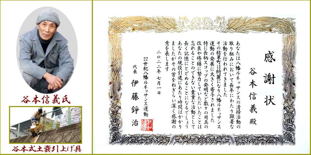 八幡ルネの「谷やん」こと、谷本氏の独特で柔軟な発想と行動力は、道路清掃を筆頭に大谷川の清掃や文化財等の清掃に意欲的に参加し、清掃のカートが壊れていれば修理を行い、大谷川ではゴミの土嚢袋を人力で運ぶのを見て「土嚢袋引上げ具」を自作するなど、現場を直視した必然性に対応できる随一の人材でした。清掃仲間とは飲んで食べてバカ話。八幡は遠いけど、たまには遊びに来てください。谷やん有難う。お元気な活躍をお祈りします。
