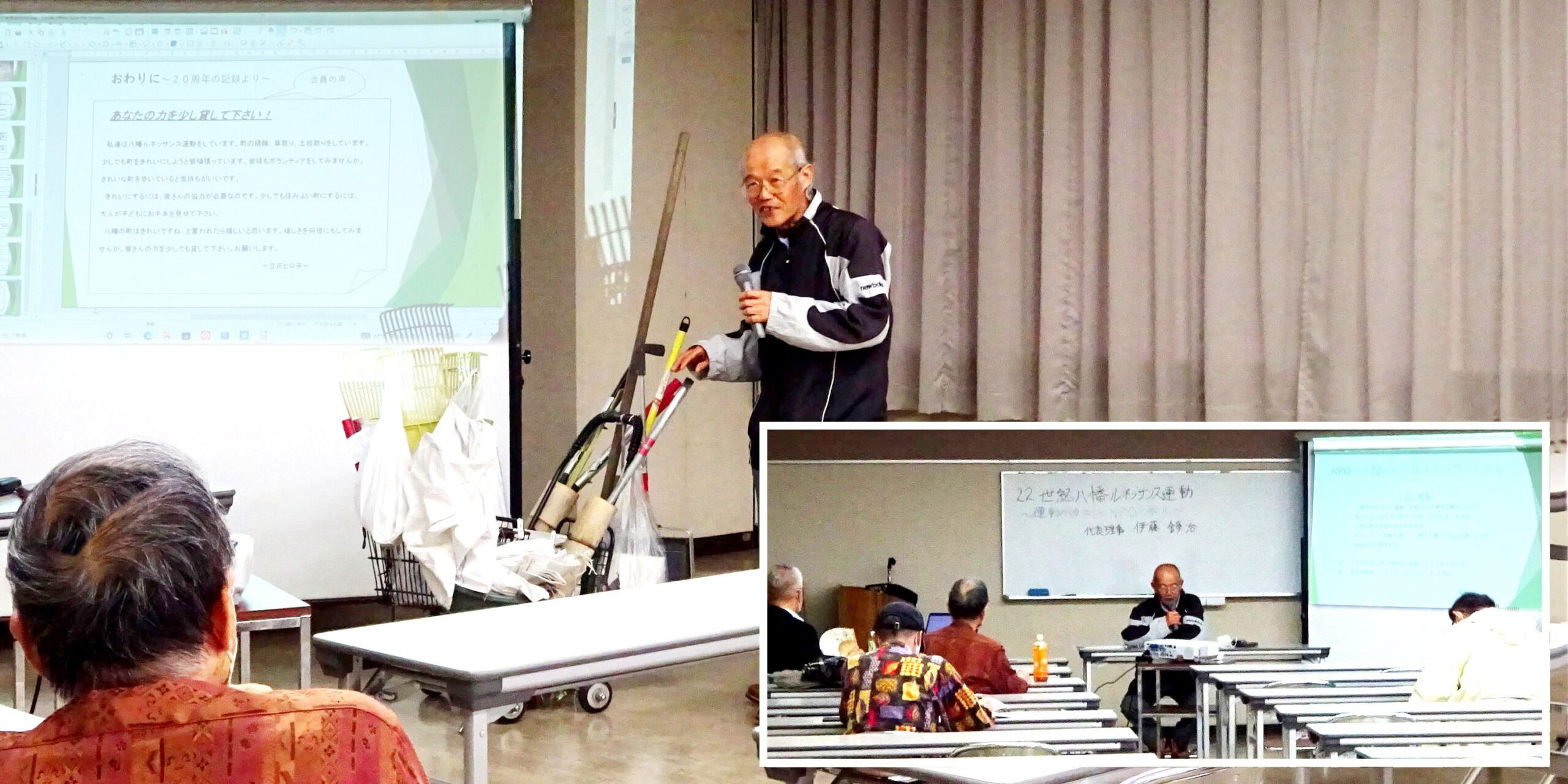 10月8日(土) 文化センターでは「ルネッサンス運動の始まりとNPO設立」と題するミニ講座が開かれ、八幡ルネ伊藤代表が講演されました。代表がゴミ拾いを始めてから20年を超える歳月が流れた今、2009年以降の最盛期を回想し、広範囲に行った清掃活動のみならず、絵画展開催や清掃仲間との飲み会などを淡々と語られていました。代表の初心とする「22世紀」には、100年先の清掃に険しい道のりを感じるも、今なお初心貫徹の努力を垣間見ました。