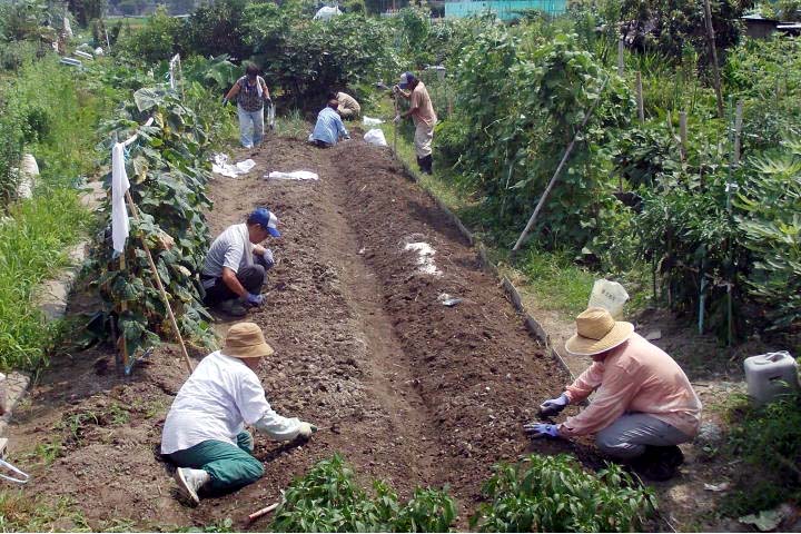 7月19日(土)、草抜きを終えた畑を耕し「苦土石灰」を撒く作業を8名で行われ、農作業の経験豊富なボランティアの指揮の下で種まきへの準備が行われました。
