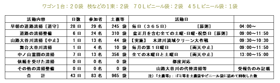 表は当月に行った八幡ルネの活動を示すものであり、定例的に実施している清掃整備活動の延べ日数・延べ参加者数・清掃整備活動で回収したゴミなどの量は、次の土嚢袋に換算して記載しています。