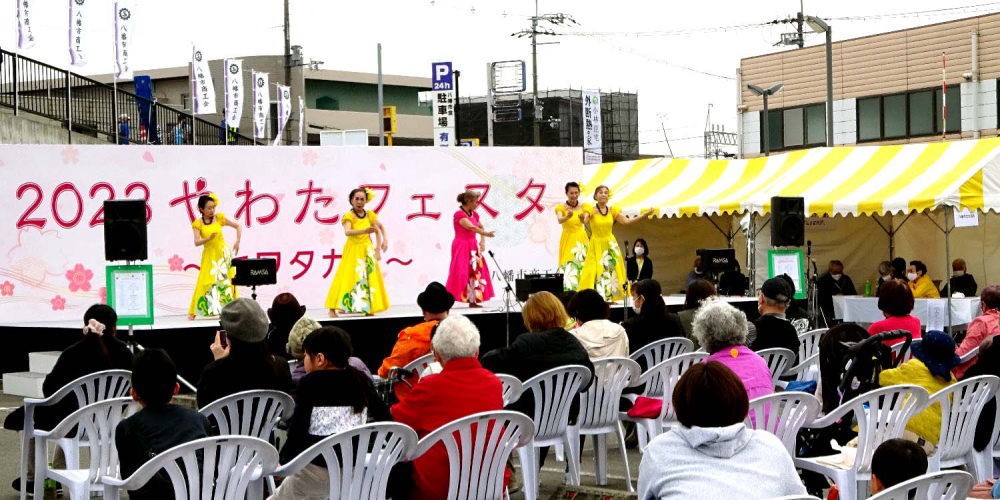 石清水八幡宮駅北側で「やわたフェスタ」が開催され、会場では自慢の飲食物や工芸品に加え、健康関係などの出店や、八幡の特産品として認定された「ヤワタカラ」の販売もありました。