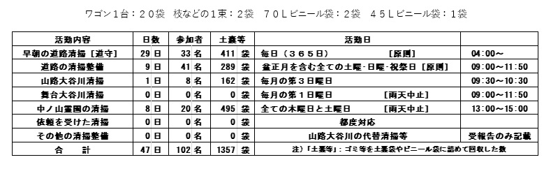 表は当月に行った八幡ルネの活動を示すものであり、定例的に実施している清掃整備活動の延べ日数・延べ参加者数・清掃整備活動で回収したゴミなどの量は、次の土嚢袋に換算して記載しています。