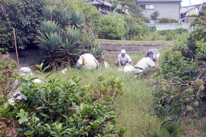 9月14日(日)の午後は伊佐家の清掃、堀の道路側にある小さな柿の木には青い柿の実や少し色づいた柿の実が生っており、残暑の中で秋を感じながら、7名のボランティアは堀の草抜きを行い、雑草は土嚢袋とビニール袋を合わせて72袋で回収しました。