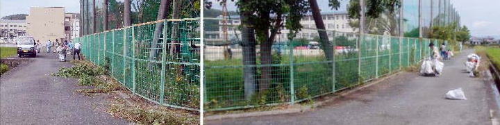 9月15日(祝)の午前中は、男山中学校の南側道路(約160m)と東側道路(約120m)を清掃、ここでも草刈り機でフェンスに沿って伸びた雑草を伐採、この日は9名のボランティアで清掃を行い、土嚢袋やビニール袋に詰めて回収した雑草は121袋でした。ご近所の方から「道が広くなった」と有り難い感謝のお言葉を戴き、改めて清掃前と清掃後を比較しますと、確かに視覚的にも道は広く綺麗になりました。