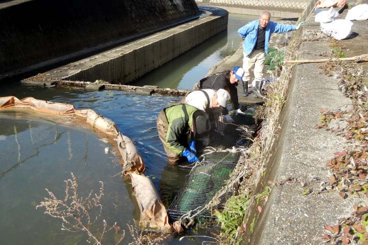 12月21日(日)、定例清掃日の清掃と平行して「竹炭による水質浄化実験」を再開すべく、ゴミフェンスで止められた「ゴミを回収」する作業から開始し、傍らで竹炭を蛇カゴに詰め込む作業を行うとともに、指定されている最も水流の緩慢な右岸よりに「竹炭(蛇籠)を設置」し、蛇籠を連結するロープを指示通りアンカーボルトに係止しました。