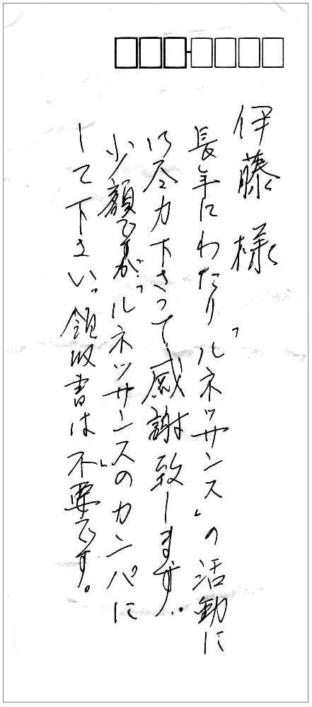 八幡ルネに1通の封書が届き、封筒の表には感謝のお言葉、封筒の中にはご寄付が入れられており、八幡市の活性化と美化を願うボランティア達にとっては一番の励ましと一同喜んでおり有り難く頂戴いたします。