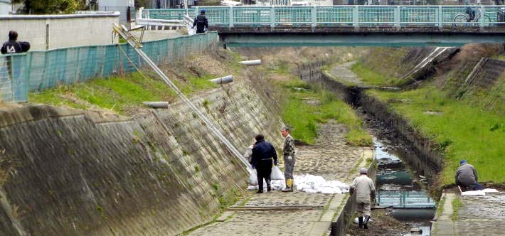 3月15日(日)は定例清掃日、水路に捨てられている空き缶やビニール袋などのゴミを拾い集め、ゴミのフェンスに留まっているゴミを取り出して回収するなどの清掃活動を行っていますが、特に右岸に蓄積した土砂に繁茂する雑草の処理は手間が掛かる作業ですが、雑草や土砂を詰め込んだ重い土嚢袋の引き揚げ作業には、電動昇降機が大活躍しております。(写真中央)