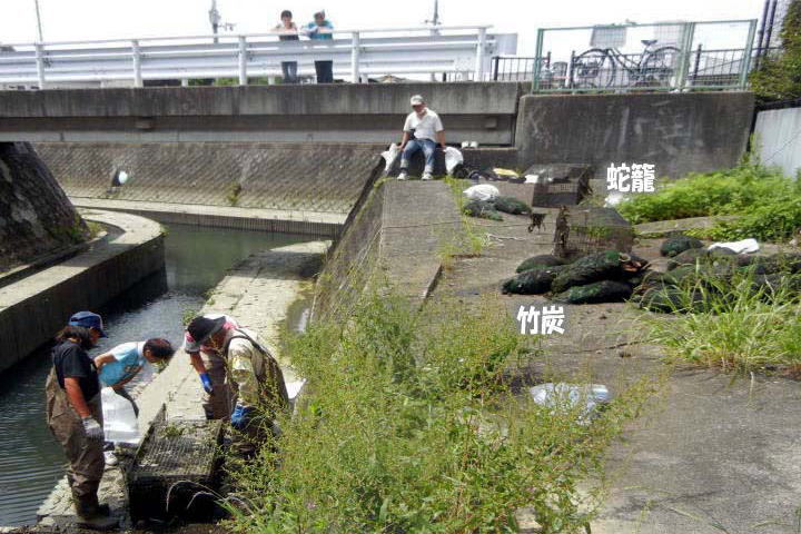 水質浄化実験を目的として、2014年10月19日に旧大谷川へ配設した竹炭を入れた蛇籠を、低水路より引き上げて撤去(写真右)することになり、旧大谷川での水質浄化実験を一時中断することになりました。