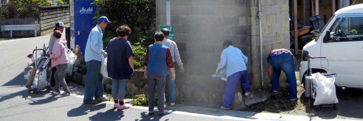 5月のゴールデンウイークも休まず道路清掃(3日の大谷川清掃を除く)を実施、5月5日(水)は八幡五反田、6日(木)は八幡三本橋と大通りより入った脇道の清掃を行いました。脇道の側溝は土砂が蓄積、土砂に生えた雑草やポイ捨てゴミ、側溝とアスファルトの隙間に生える雑草などを土砂とともに回収、両日ともご近所の方の参加もあって清掃作業が快調に進み、八幡三本橋の清掃では近所の方から飲物の差し入れがあって、休憩時(写真右)に有り難く頂きました。八幡五反田の清掃ではボランティアとご近所の方で14名の参加者となり、ゴミや土砂を土嚢袋85袋で回収、八幡三本橋の清掃でもご近所の方が加わって12名の参加者になり、回収したゴミ土砂の土嚢袋の数は78袋、両日で延べ26名の参加者で163袋のゴミ土砂を回収しました。