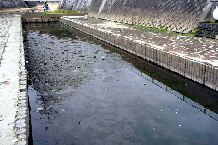 “みなさんの「気づき」を、地域の安心・安全や景観美化に” をテーマとした、京都府が行う府民協働型の公共事業に、八幡ルネは「街路樹」の植え替えや整備、大谷川の河川敷に出来た「万年水溜まり」(写真右)の改善対策について応募し、「大谷川に堆積するヘドロや土砂」の浚渫(写真左)については、大谷川の整備に尽力されているボランティアにより、「大谷川の美化とボランティアによる清掃活動の効率化」について応募するとともに、低水路の小さな「堰」のような場所には帆布が絡まっており、その後ブルーシートが被せられたが目的等が理解できず、景観も損なうことから報告を兼ねて美化への対応を応募された。