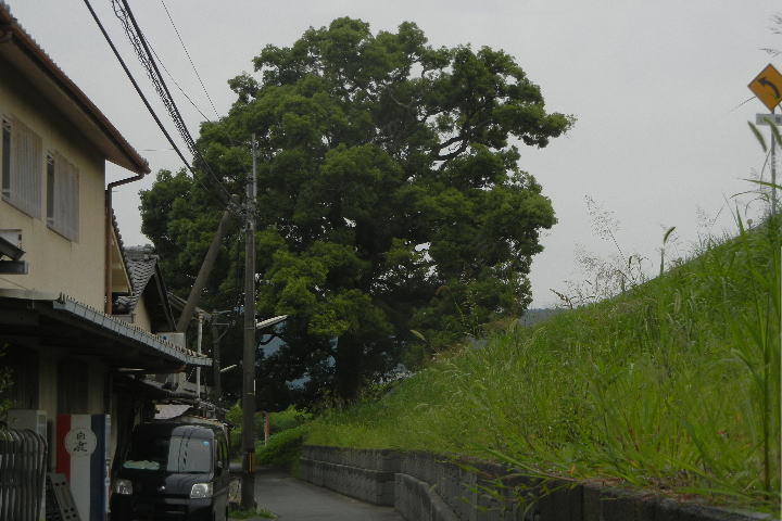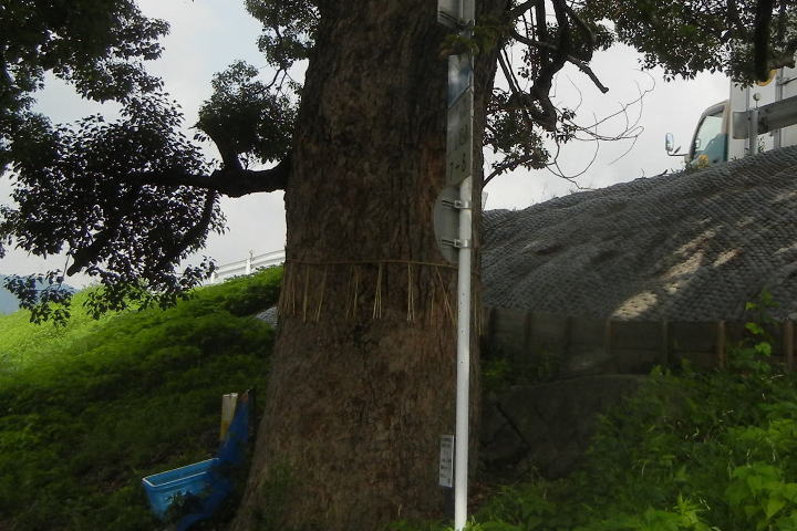 八幡市駅より旧京阪国道(府道13号)を橋本に向かうと、左側には樹齢1000年とも言われている大きな「楠」があり、この「楠」を伐採する方針の国交省等と温存を願う市民との間で話し合いが進められている。