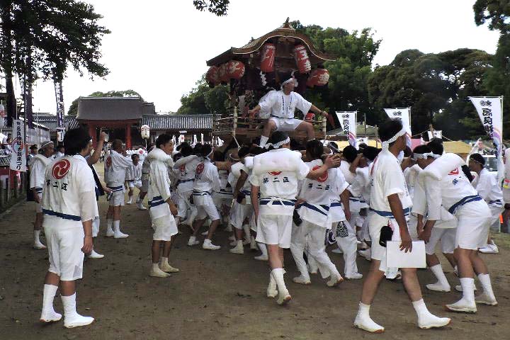 翌18日も雨が降り続いていたたが、太鼓まつりへの情熱に答えるかのように、正午には陽の光が差し込み、楽しみにしていた太鼓の音が「ヨッサーヨッサー」ドンドンドンと鳴り響き、本番の19日は晴れたり曇ったり、約70名の警察官が警護にあたっていると言われる中、クライマックスとなる御輿の宮入が行われ、太鼓橋(安吾橋)の前は御輿と見物客で大混雑、子供の御輿の後に六区・三区・二区・一区の順に御輿が境内の参道を往復し、歴史ある八幡市の夏の風物詩「太鼓まつり」が無事に終わりました。